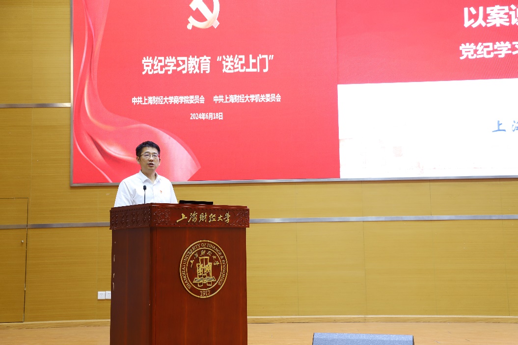 6月18日下午,上海财经大学商学院党委与机关党委在创业中心报告厅联合开展党纪学习教育专题活动,校党委副书记、纪委书记何鹏程“送纪上门”,做题为《以案说纪 警钟长鸣——党纪学习教育警示案例剖析》专题讲座暨纪律党课。商学院党委和机关党委教职工党员和关键岗位人员,以及金融学院证券系教工党支部参与本次学习。活动由机关党委书记张喆主持。