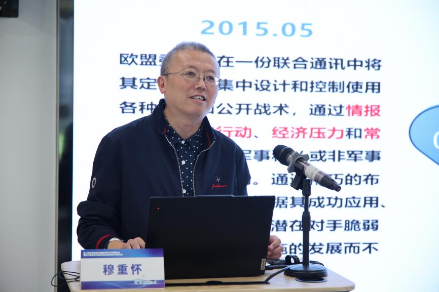 下午,外国语学院教师王莉娜和张纪腾分别主持了上半场和下半场的发言环节。辽宁大学穆重怀教授的发言以波罗的海海底电缆受损事件为例,分析欧盟“混合战争/威胁”理论的形成与特征,还从法律(主导或参与相关立法、加强普法)、技术(制定防护标准、建监管体系等)、舆论(建立应对话语体系、推动协同发声)三方面提出应对策略。