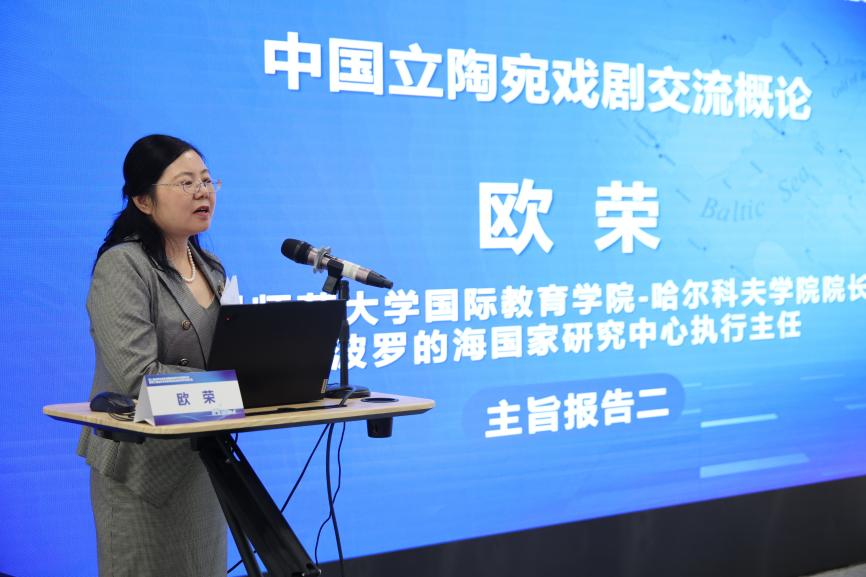 上海财经大学外国语学院副院长杨国静教授主持上午下半场的发言环节。杭州师范大学环波罗的海国家研究中心执行主任欧荣教授作题为《中国与立陶宛戏剧交流概论》的主旨发言,梳理立陶宛独立以来戏剧发展及自1991年建交以来两国戏剧交流历程,分析文化差异、体制障碍及政治因素,强调以翻译为桥梁、拓展青年交流平台、挖掘共通叙事主题,使戏剧成为增进理解与和平的重要纽带。