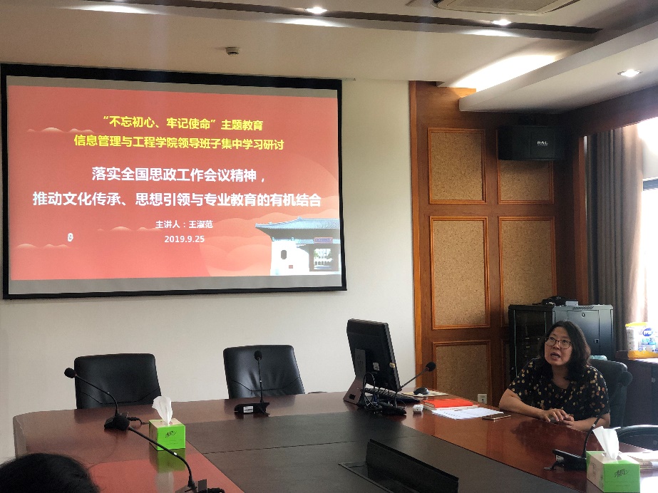 信息管理与工程学院按照《中共上海财经大学委员会开展“不忘初心、牢记使命”主题教育工作方案》,对照“原原本本学、集中研讨学、融会贯通学”的要求,在2019.9.23-9.27一周时间内围绕主旨研讨、主题观影、主题调研三个板块,共开展活动8场次。